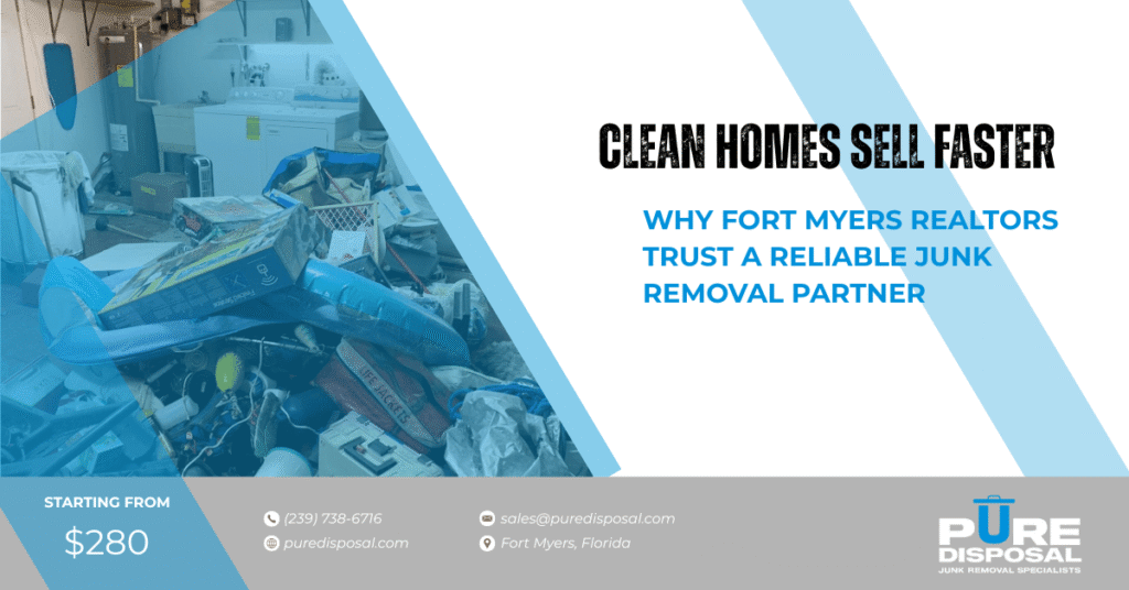 Local agents need a junk removal service they can count on, and Pure Disposal has become the trusted choice for many realtors in Fort Myers. Pure Disposal is Fort Myers-based and serves all of Lee County, including Cape Coral, Bonita Springs, and Lehigh Acres.Here’s why partnering with Pure Disposal gives Realtors a competitive advantage: